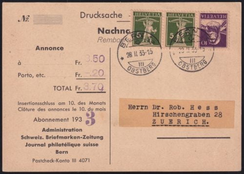 Liechtenstein, Freimarken, Nr.169+, Nachnahme nach Kilchberg, sauber gestempelt TRIESENBERG