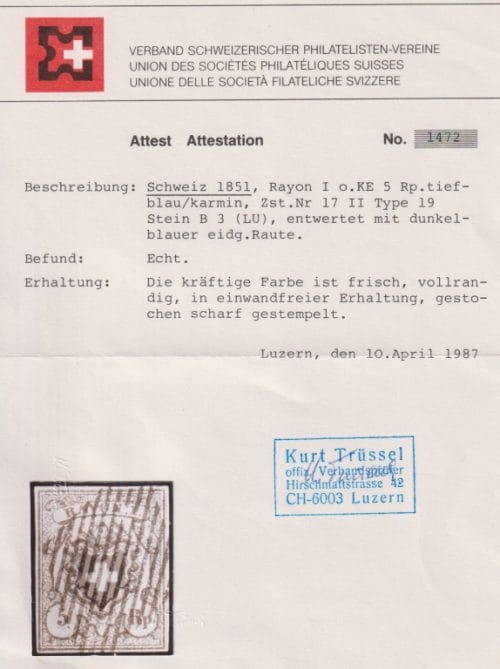 farbfrische, knapp/vollrandige Marke, breite Bogenecke, kleines Eckbüglein, Attest Trüssel