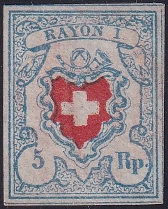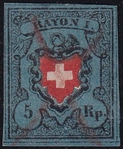 Schweiz, Altschweiz, Rayon, Nr.15II, dunkelblau ohne Kreuzeinfassung, Ty.35, vollrandig, saubere Rötelentwertung, rückseitig minim dünn