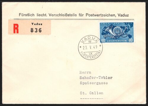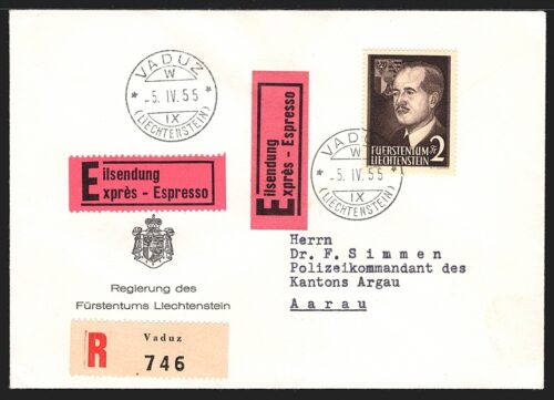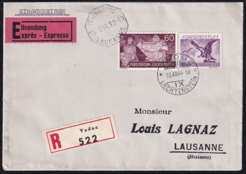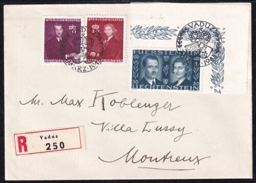 Liechtenstein, Freimarken, Nr.238-239+, auf R-Express-Brief nach Genf, mit Sonderstempel 100 Jahre POSTAMT VADUZ