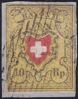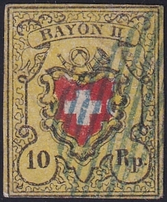 Schweiz, Altschweiz, Rayon, Nr.16II, gelb, ohne Kreuzeinfassung, Ty.18 E-LO, knapp/vollrandig, blaue eidg.Raute