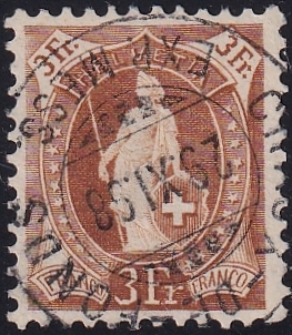 Schweiz, Sitzende Helvetia, Nr.36, 1Fr.golden, sauber gestempelt FAHRWANGEN