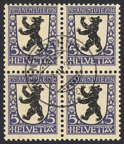 Schweiz, Pro Juventute, Kantonswappen, Nr.29, im Viererblock, gestempelt WINTERTHUR