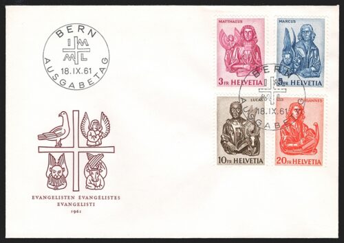 Schweiz, FDC, 1961, Evangelisten, Nr.381-384, komplette Serie, unadressierter illustrierter Umschlag, offizielle ET-Stempel