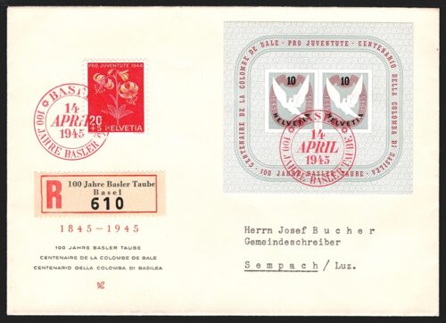 Schweiz, FDC, Zuschlagsausgaben, Blocks, Basler-Taube Block W 24, illustrierter R-FDC, offizieller roter ET-Stempel, dazu Ankündigungsblatt