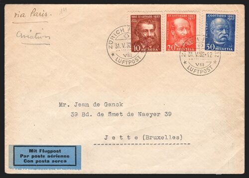 Schweiz, FDC,Freimarken, Nr.191-193, 50 Jahre Gotthardbahn, adressierter FDC nach Brüssel, ET-Stempel ZÜRICH FLUGPLATZ