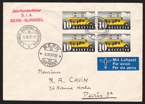 Schweiz, FDC,Freimarken, Nr.210x, Automobilpostbüro, im Viererblock, adressierter Luftpost-FDC nach Paris, ET-Stempel AUTOMOBIL-POSTBUREAU