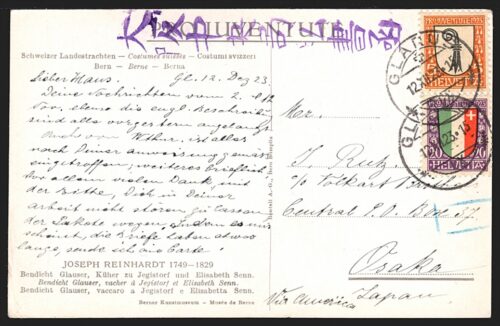 Schweiz, Frankaturen, Pro Juventute, Nr.25/27, auf Pro Juventute-Karte Nr.106, nach OSAKA, gestempelt GLARUS