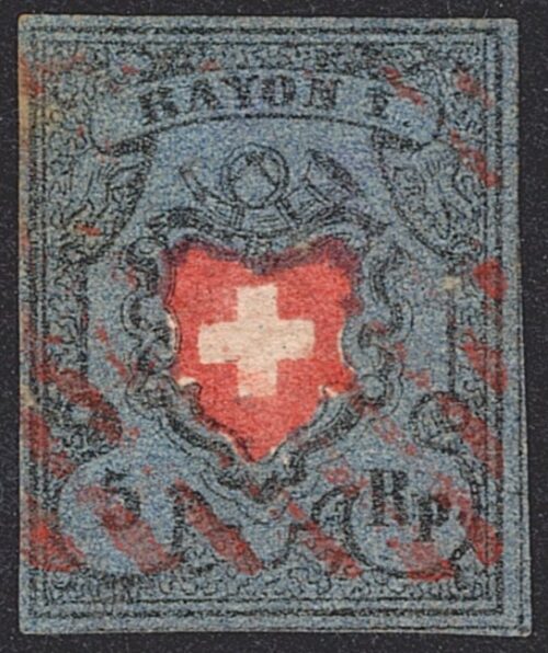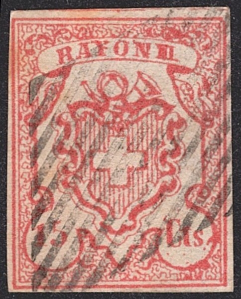 Schweiz, Altschweiz, Rayon lll, grosse Wertziffer, Nr.20, Typ 1/MR-l, breitlrandige Marke, schwarze Raute