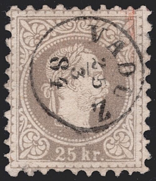 Österreich 1867 25 Kreuzer ANK Nr. 40 II a „lilagrau“ mit senkrechtem Naht-Wasserzeichen „Ladurner“ gestempelt PRAG in blau