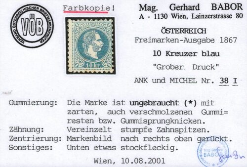 Österreich 1867 10 Kreuzer ANK Nr. 38 I „blau“ ungebraucht ohne Gummi