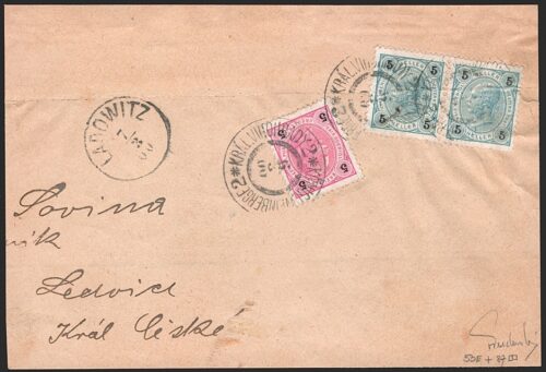 Österreich 1890 5 Kreuzer + 1899 5 Heller als Währungs-Mischfrankatur gleicher Wertstufen auf Briefstück nach LADOWITZ