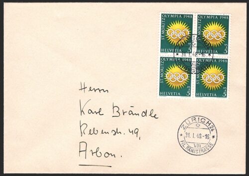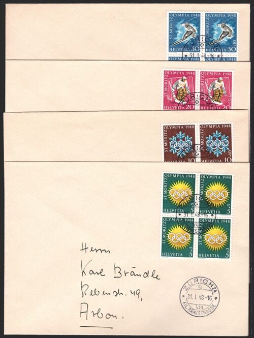 Schweiz, Blocks, Nr.25-28 je im Viererblock auf adressierten Umschlägen, Stempel ZÜRICH 24