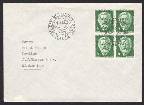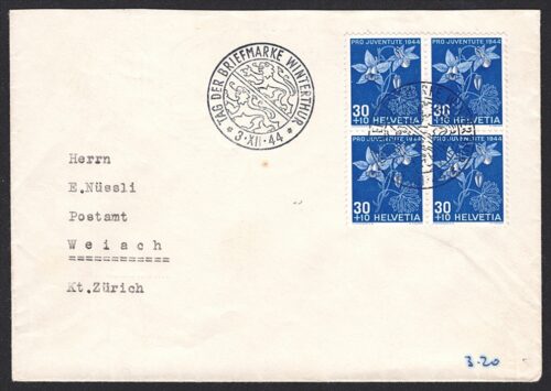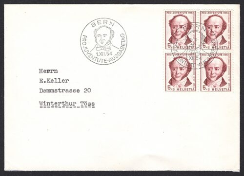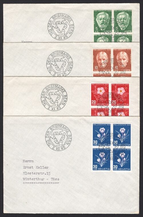 Schweiz, Pro Juventute, Nr.113-116, Blumen und Bildnisse, komplette Serie, im Viererblock auf 4 Umschlägen, TAG DER BRIEFMARKE