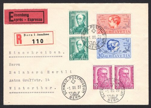Schweiz, FDC, Pro Juventute, Nr.81-84, überkomplett auf portogerechtem R-Express-FDC, POSTMUSEUM