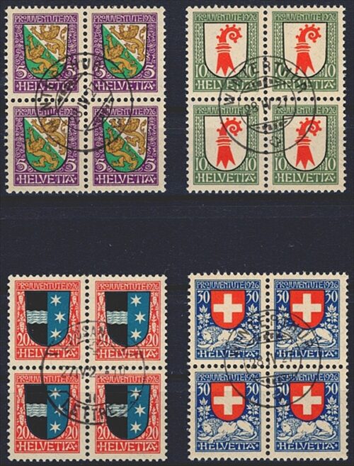 Schweiz, Pro Juventute, Nr.25-28, Wappen, komplette Serie, im Viererblock
