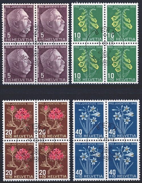 Schweiz, Pro Juventute, Nr.45-48, Wappen und Henri Dunant, komplette Serie, im Viererblock