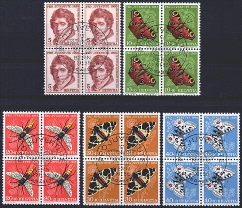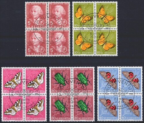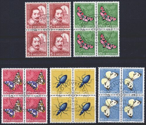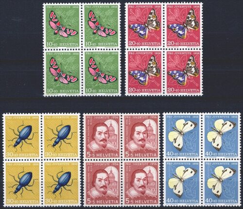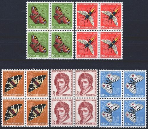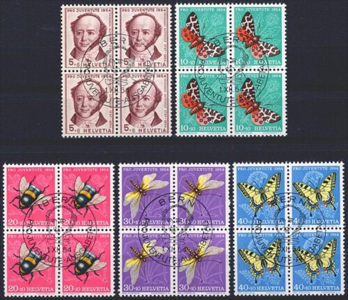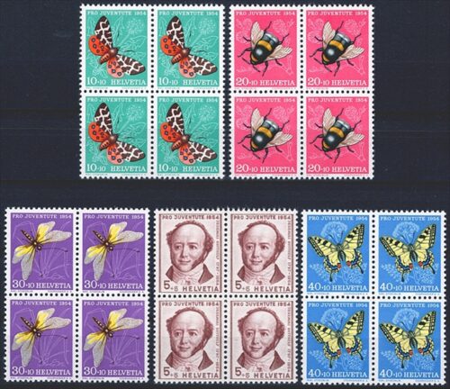 Schweiz, Pro Juventute, Nr.143-147, Insekten und Bildnis, komplette Serie, im Viererblock