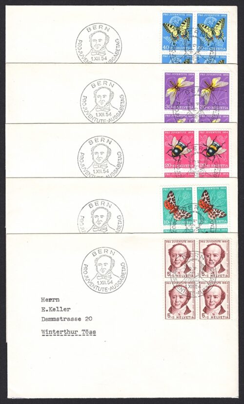 Schweiz, Pro Juventute, Nr.148-152, im Viererblock, ET-Stempel, je auf Umschlag