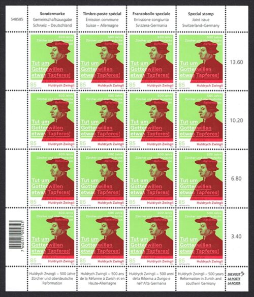 Schweiz 2019 SBK Nr. 1733 „Huldrych Zwingli – 500 Jahre Züricher und oberdeutsche Reformation“ 16er Bogen CHF 0.85er postfrisch zum Frankieren