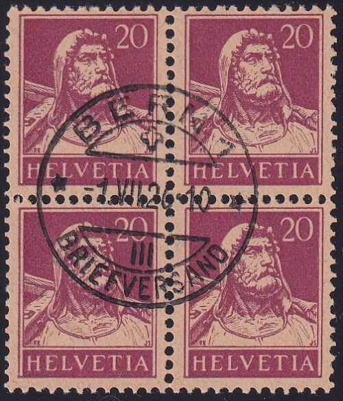 Schweiz, Freimarken, Tellbrustbild, Nr.154, 20Rp. rotlila, im Viererblock, sauber gestempelt BERN
