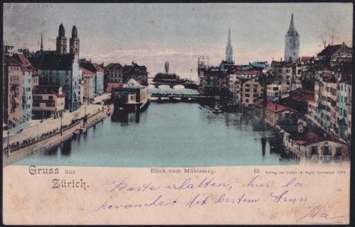 Schweiz Lithographie 1899 „Gruss aus Zürich“ Blick vom Mühlesteg