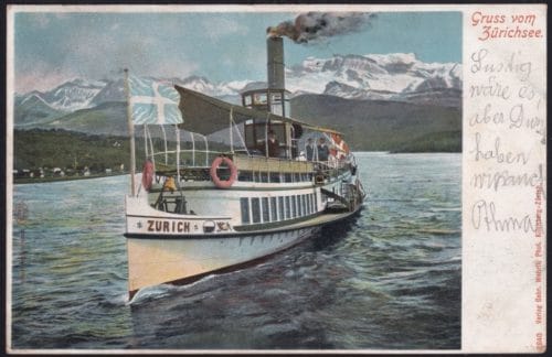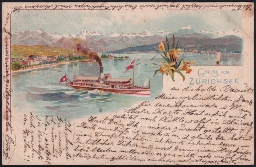 Schweiz Lithographie 1902 „Gruss vom Zürichsee“