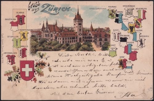 Schweiz Lithographie 1900 „Gruss aus Zürich“ mit Kantonswappen