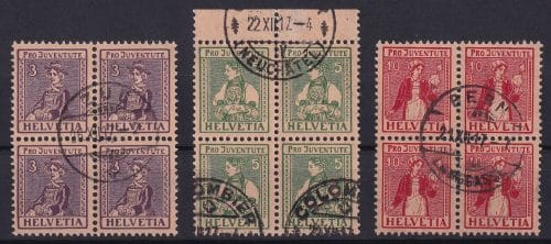 Schweiz Pro Juventute 1917 SBK Nr. J7 bis J9 im 4er Block gestempelt
