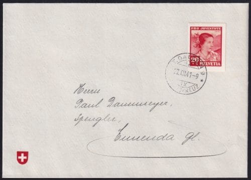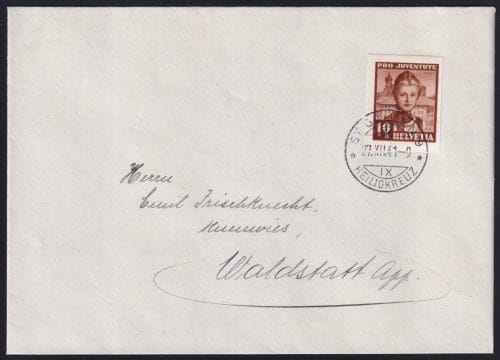 Schweiz Pro Juventute 1941 SBK Nr. J98I Blockausschnitt auf Brief entwertet St. Gallen Heiligkreuz