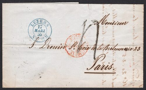 Schweiz, Abstempelungen, Postgeschichte, Faltbrief, LUZERN blau, SUISSE ST.LOUIS rot, nach Paris