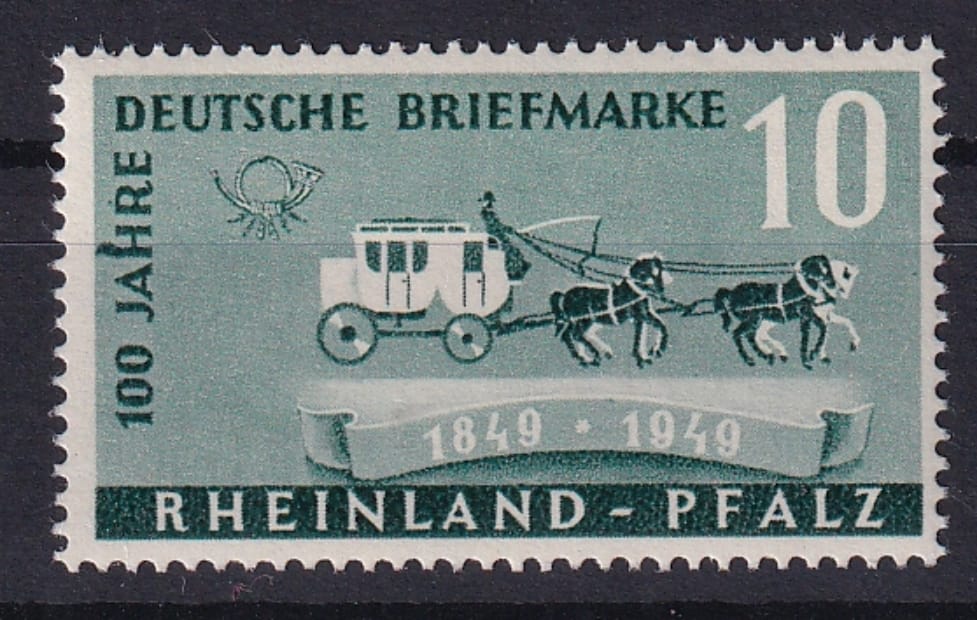 Deutschland 1949 Franz. Zone Rheinland Pfalz, 100 Jahre deutsche Briefmarke, 10 Pf. mit verlängertem „J“