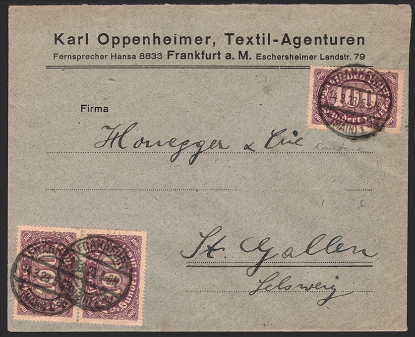 Deutschland, Deutsches Reich, Freimarken, Nr.219 (3x), auf Auslandsbrief nach St.Gallen , FRANKFURT 14.3.1923