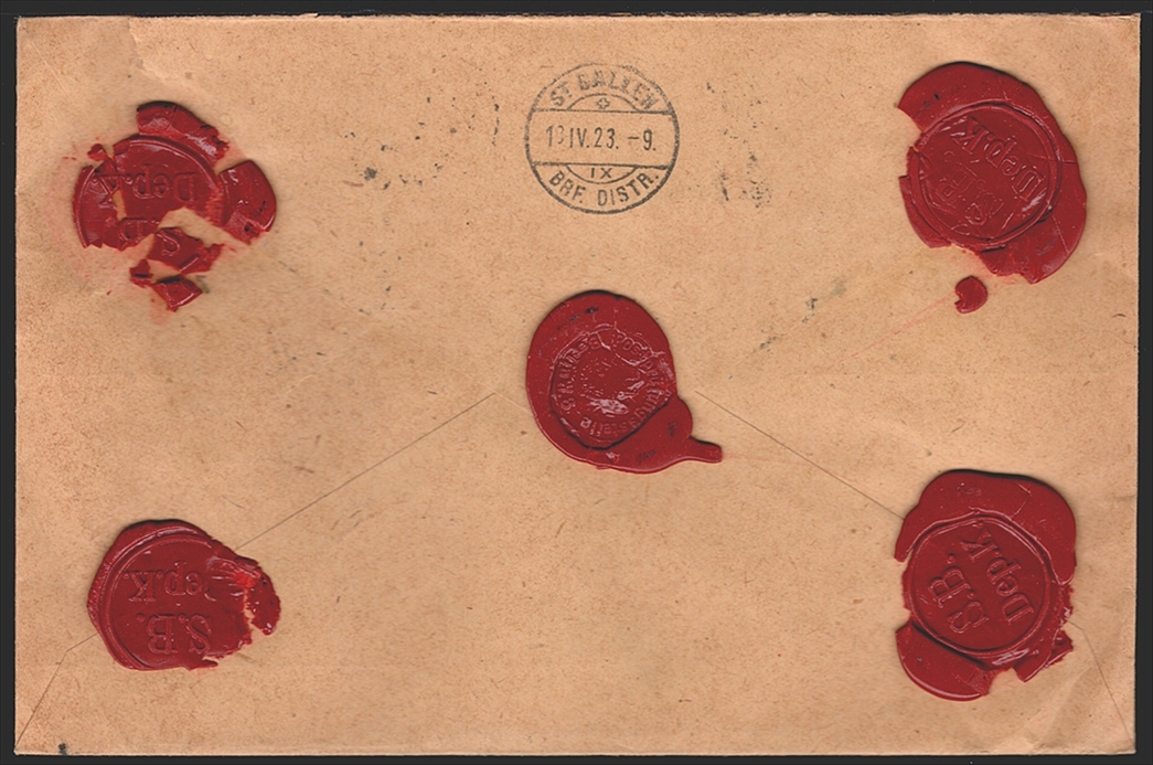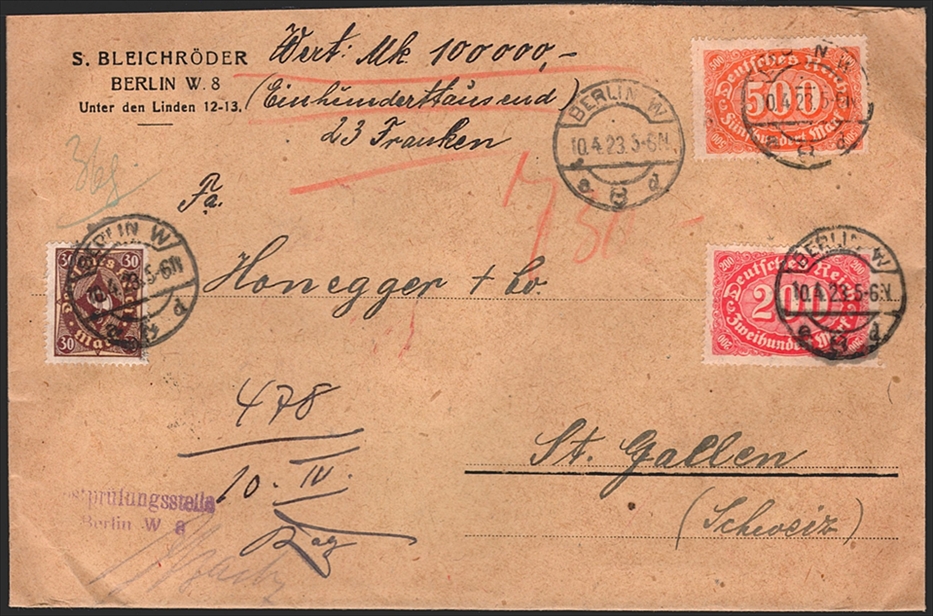 Deutschland, Deutsches Reich, Freimarken, Nr.248/251/208, Auslandswertbrief nach St.Gallen, Zensur, BERLIN 10.4.1923