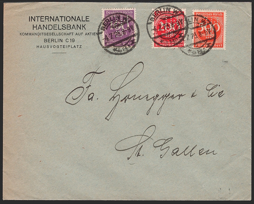 Deutschland, Deutsches Reich, Freimarken, Nr.268/269/272, auf Auslandsbrief nach St.Gallen, alle Werte mit Firmenlochung, BERLIN 4.7.1923