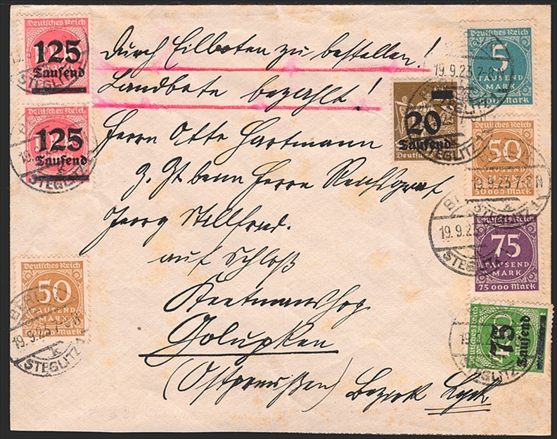 Deutschland, Deutsches Reich, Freimarken, Nr.274+, attraktive Buntfrankatur portogerecht auf Expressbrief (75 Tsd Briefgebühr + 450 Tsd Landzustellgebühr), BERLIN 19.9.1923