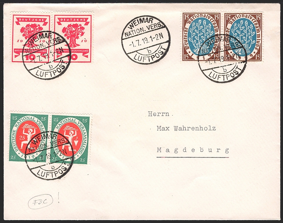 Deutschland, Deutsches Reich, Nr.107-109, Nationalversammlung, in Paaren auf FDC, WEIMAR NATION.VERS. LUFTPOST