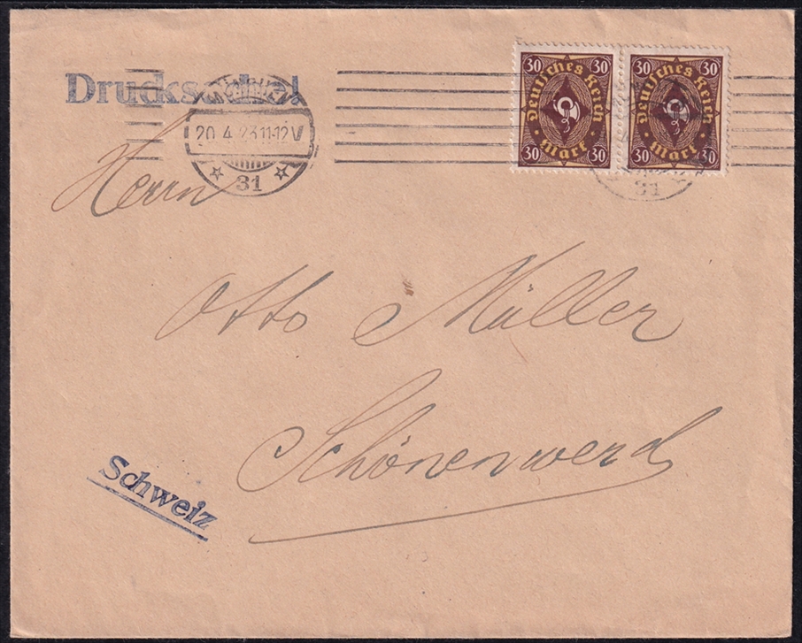 Deutschland, Deutsches Reich, Nr.208W im Paar auf Drucksache nach Schönenwerd (Tarif 4 Monate möglich)