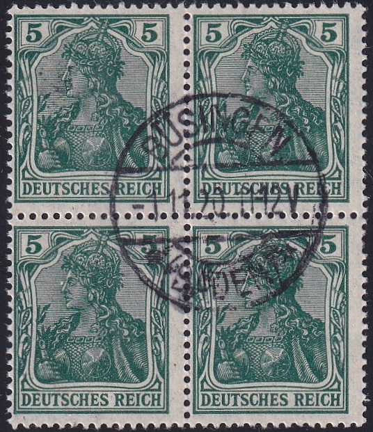 Deutschland, Deutsches Reich, Nr.85 IIa, 5 Pfg., Kriegsdruck, im Viererblock, sauber gestempelt BÜSINGEN, signiert Zenker