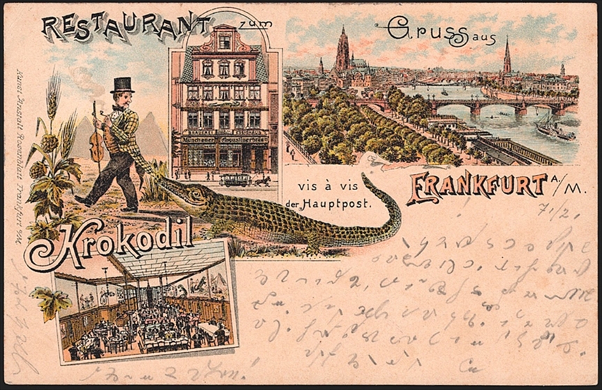 Deutschland, Lithographien, Gruss aus FRANKFURT RESTAURANT ZUM KROKODIL, 4 Bilder, 1897