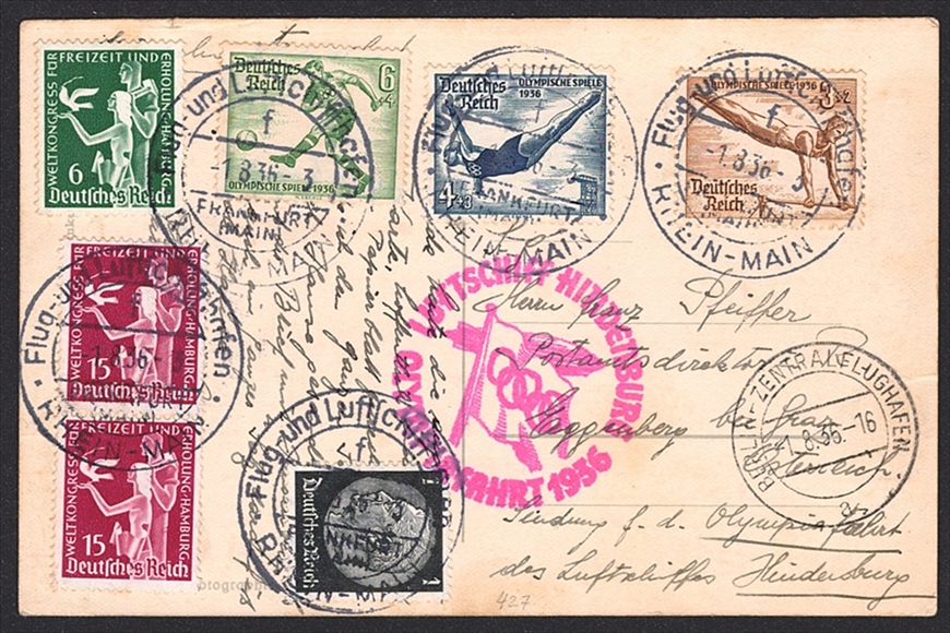 Deutschland, Zeppelin, Olympia-Fahrt 1936, Aufgabe Rhein-Main, teilweise mit Olympia-Marken frankiert, Ansichtskarte Köln