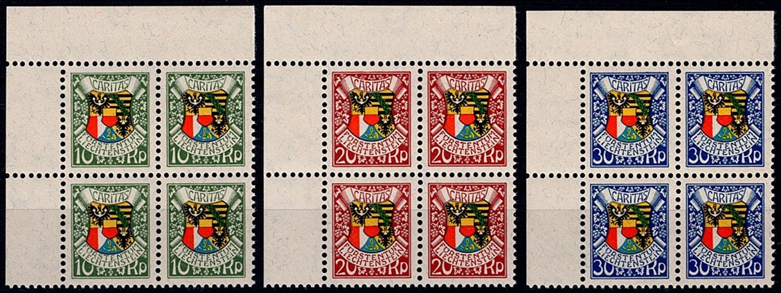 Liechtenstein 1927 Serie Mi. Nr. 75 bis 77 in 4er Blocks postfrisch ** mit Bogenecken