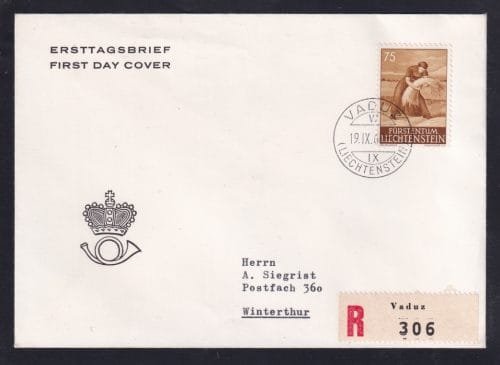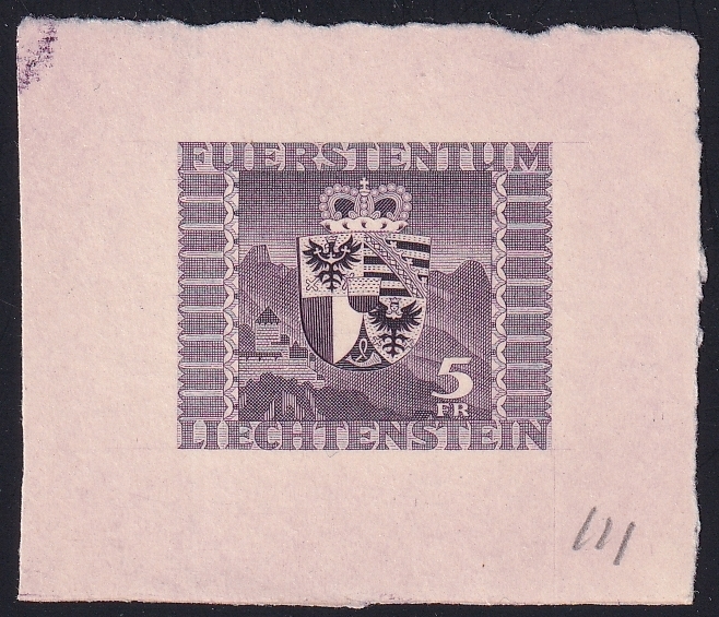 Liechtenstein 1945 Mi. Nr. 243 ungezähnte Farbprobe – Einzelabzug in dunkelrotviolett ohne Gummi auf Kartonpapier