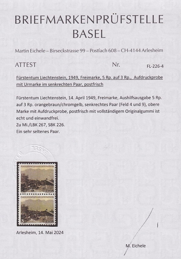 Liechtenstein 1949 Mi. Nr. 267 – Aufdruckprobe mit Urmarke als Paar