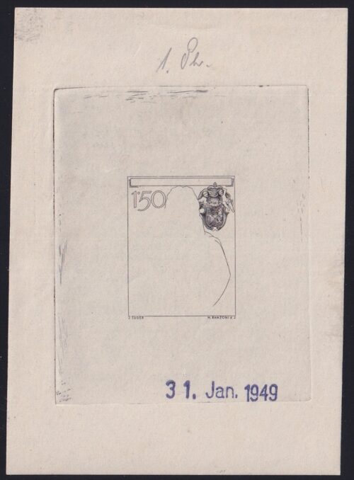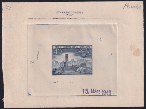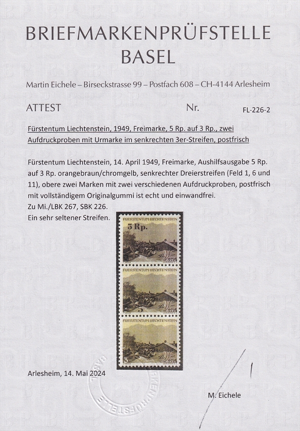 Liechtenstein 1949 Mi. Nr. 267 – zwei Aufdruckproben mit Urmarke als 3er Streifen
