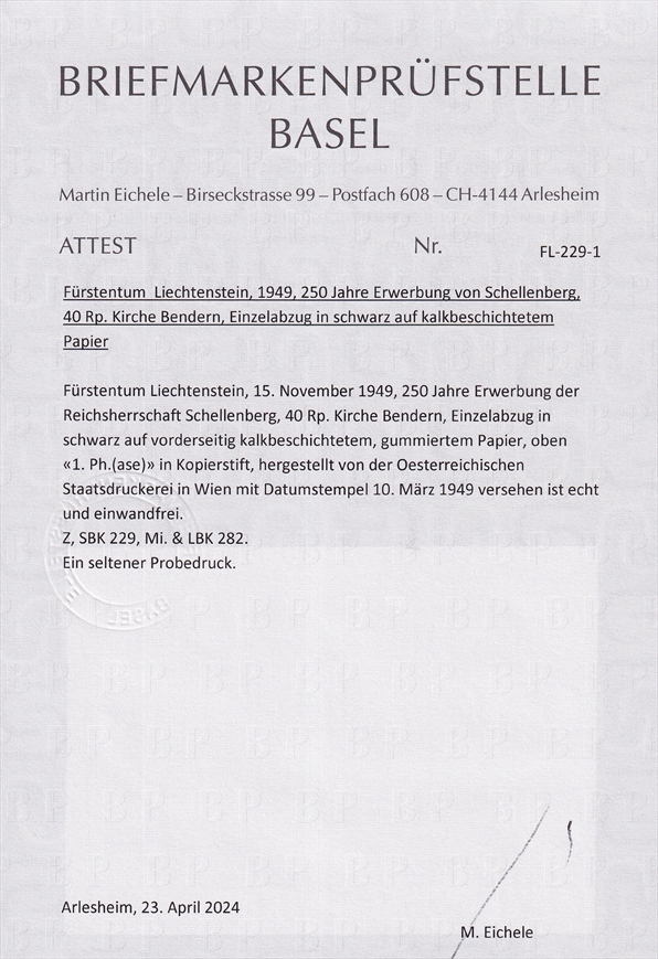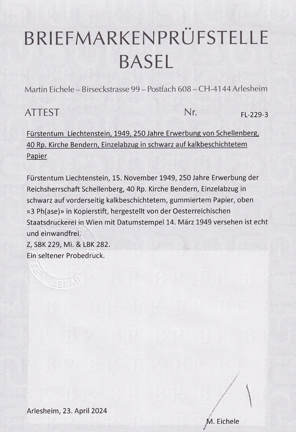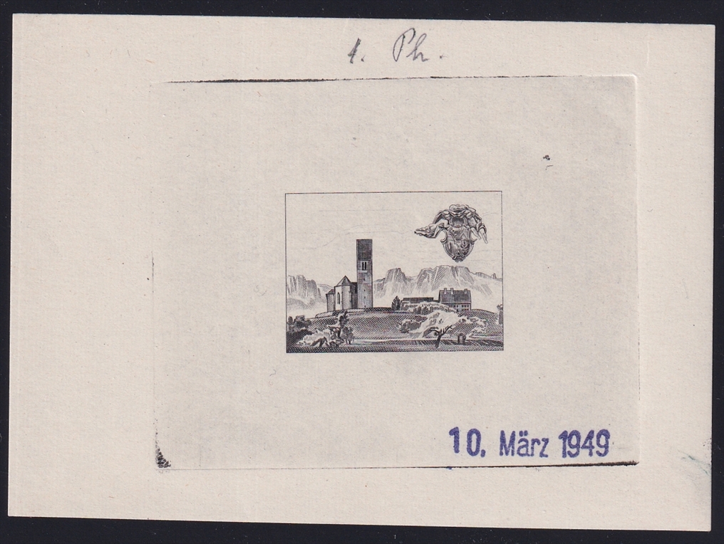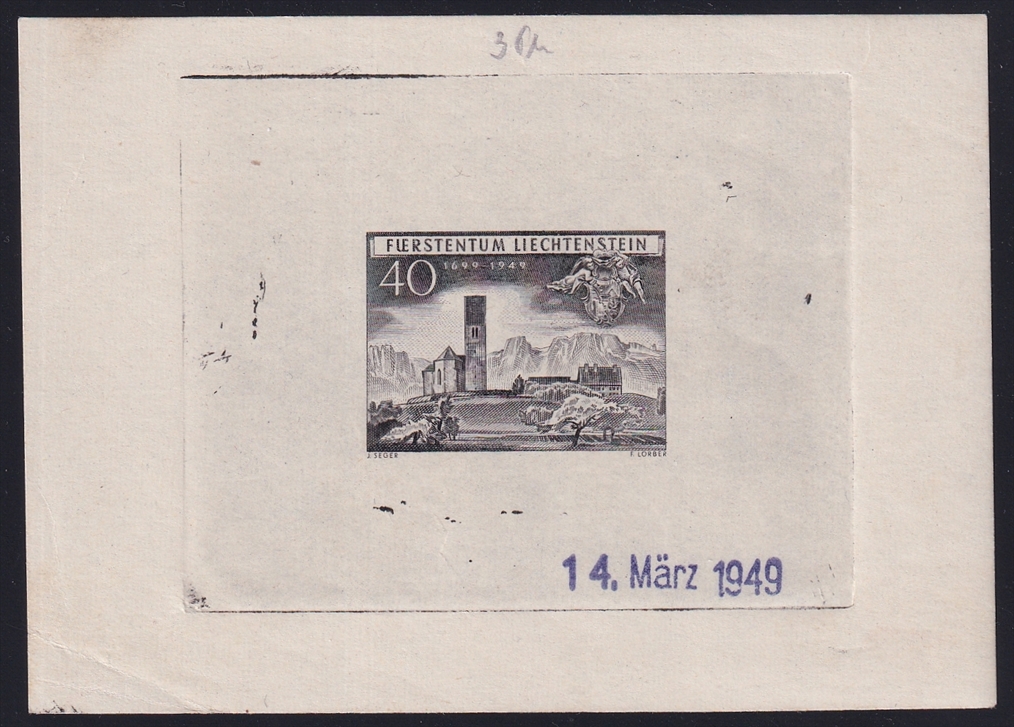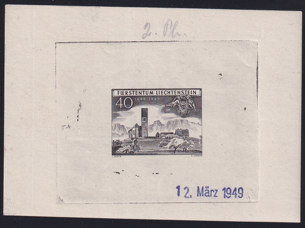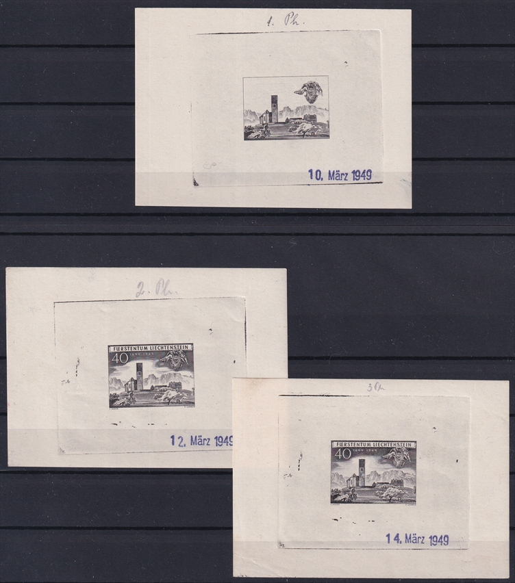 Liechtenstein 1949 Mi. Nr. 282 ungezähnter Werdegang in 3 Phasen als Einzelabzüge in Schwarz