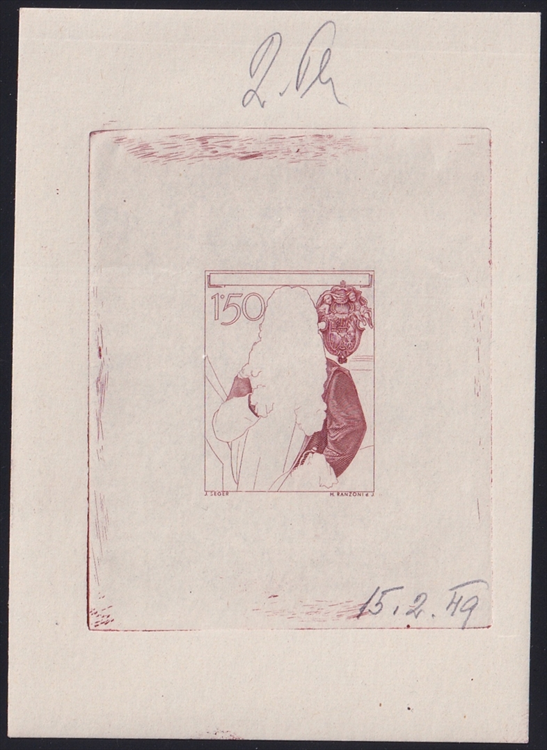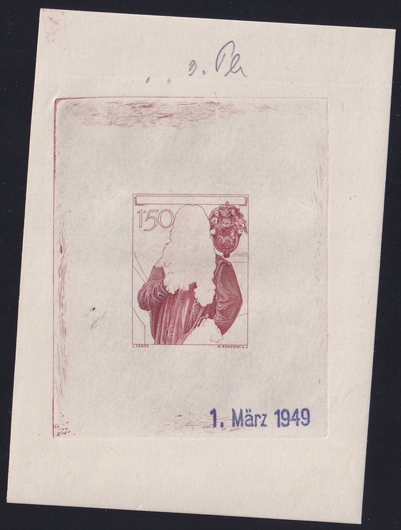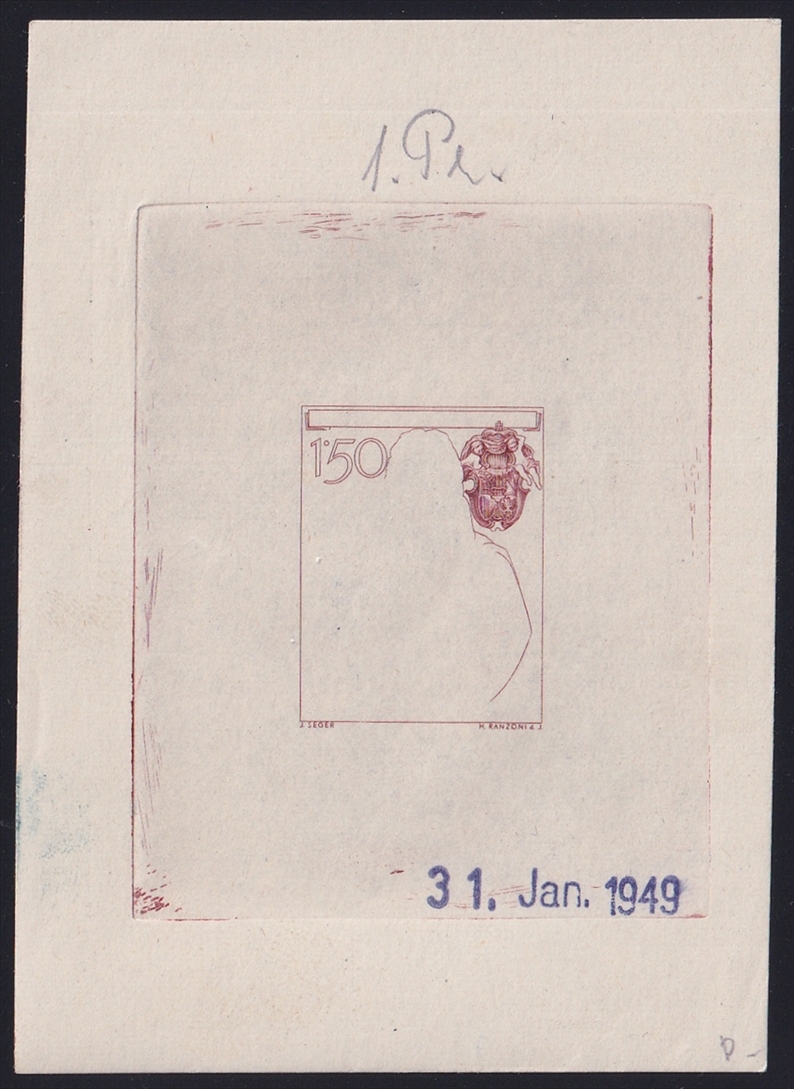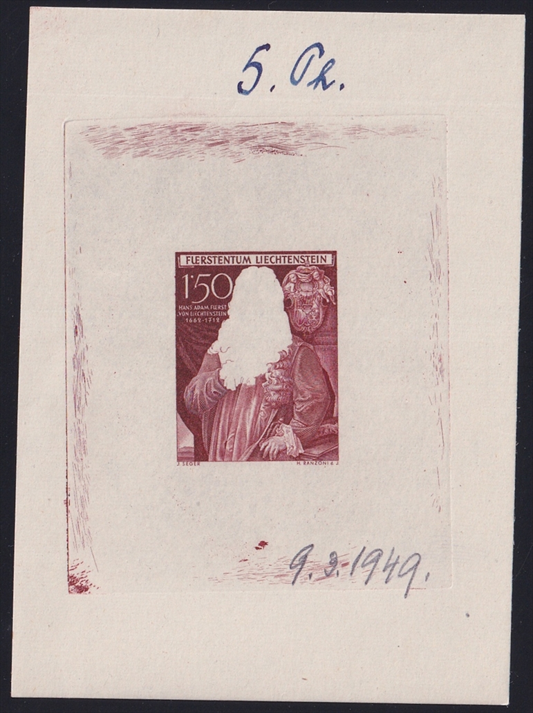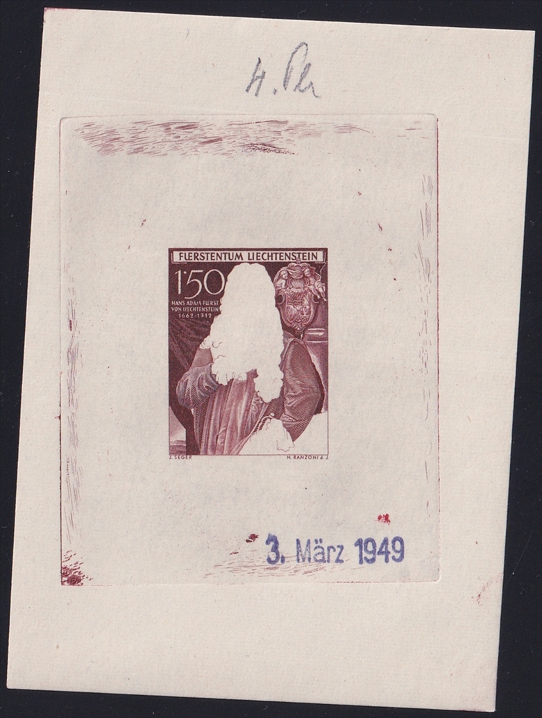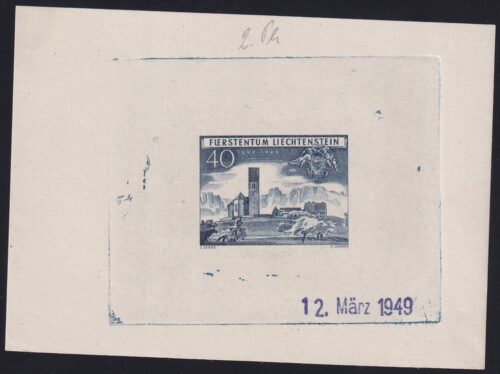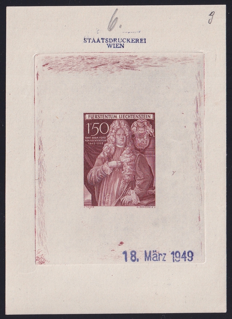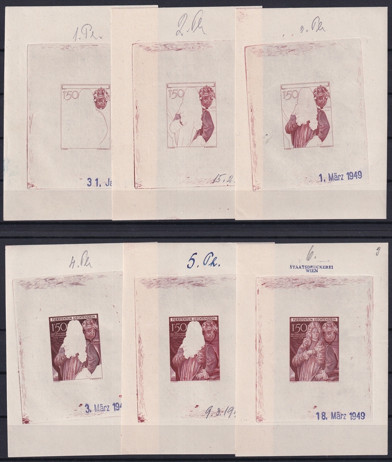 Liechtenstein 1949 Mi. Nr. 283 ungezähnter Werdegang in 6 Phasen als gummierte Einzelabzüge in verausgabter Farbe