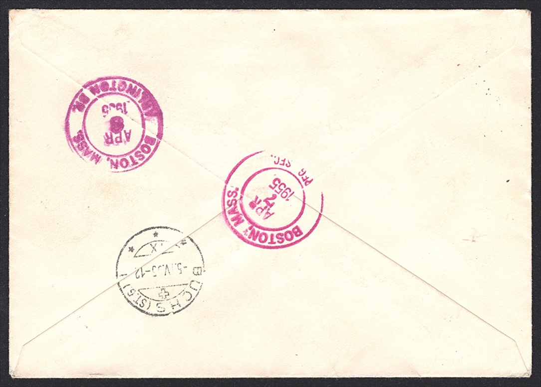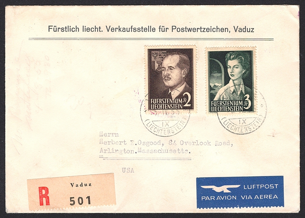 Liechtenstein 1955 Serie Nr. 332/333 auf R-Brief (FDC) in die USA