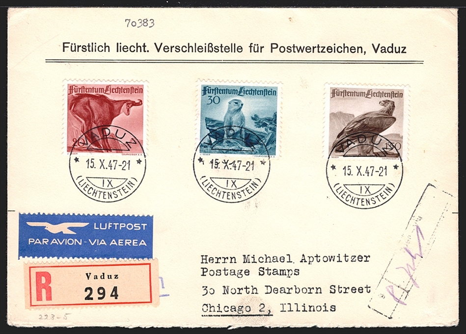 Liechtenstein, FDC, Freimarken, Jagd-Serie ll, Nr.213-215, gestempelt VADUZ, R-FDC nach USA