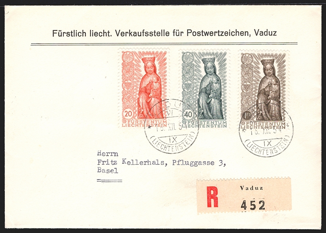 Liechtenstein, FDC, Freimarken, Marianisches Jahr, Nr.273-275, komplette Serie, gestempelt VADUZ, R-FDC nach Basel
